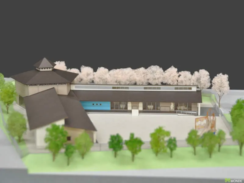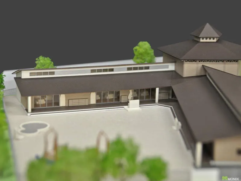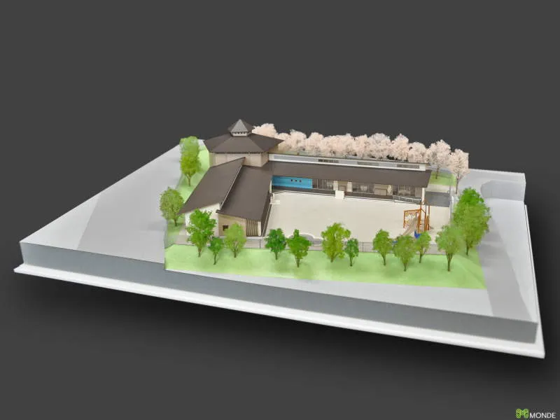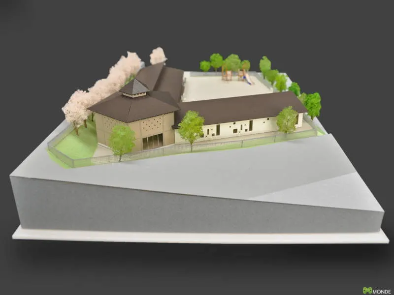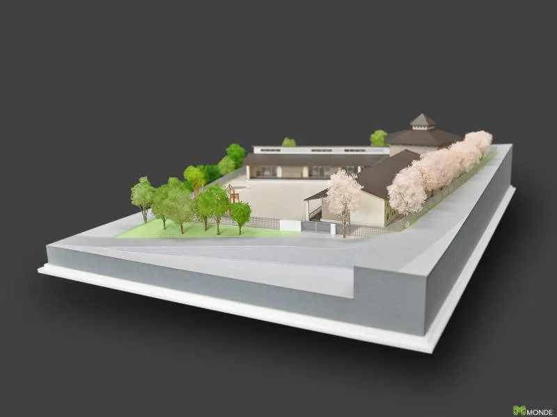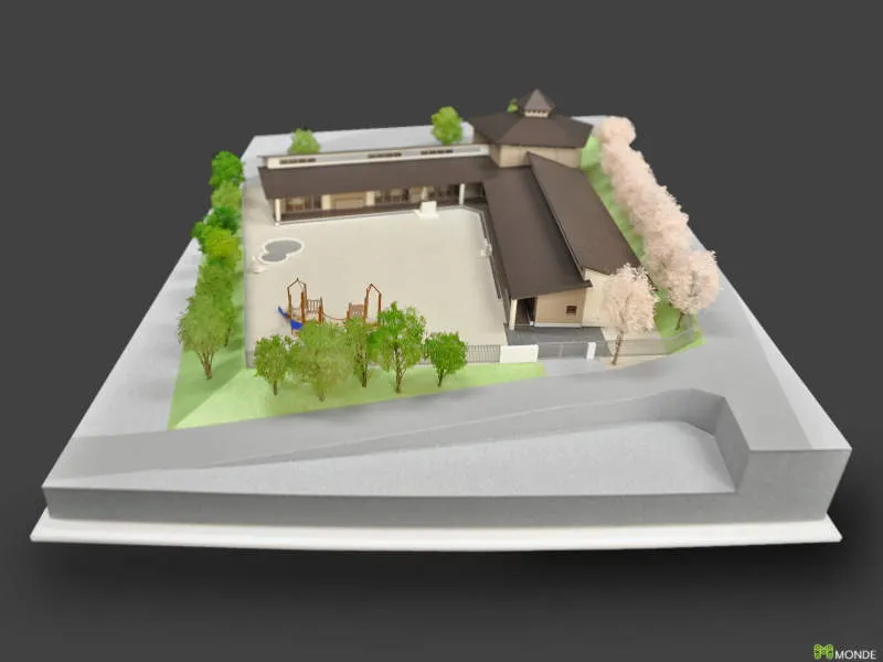 温かみのある木造平屋建ての保育所模型です。