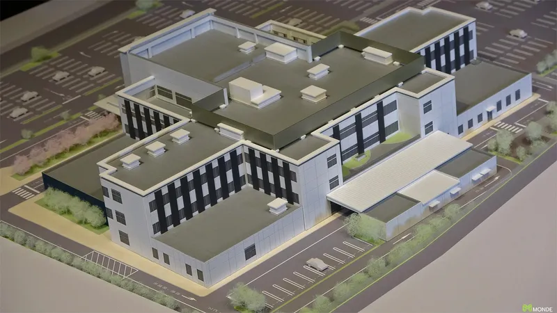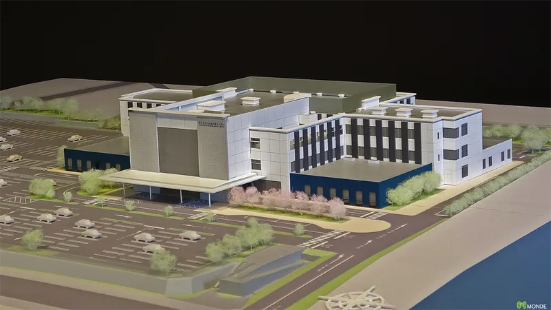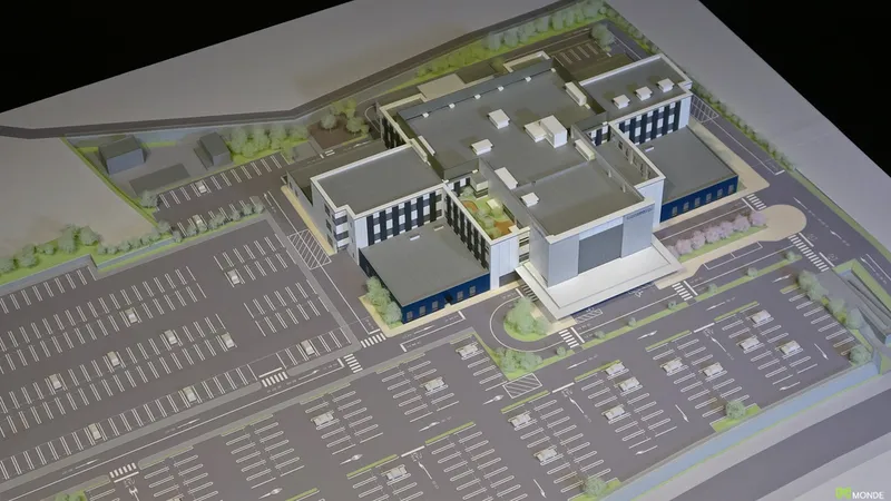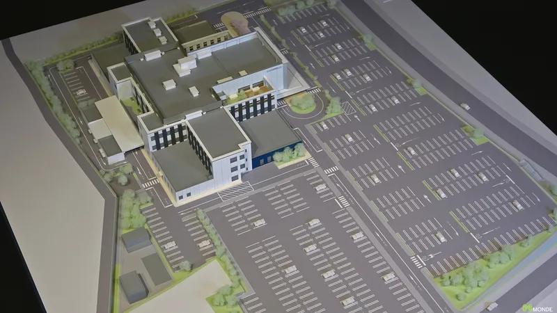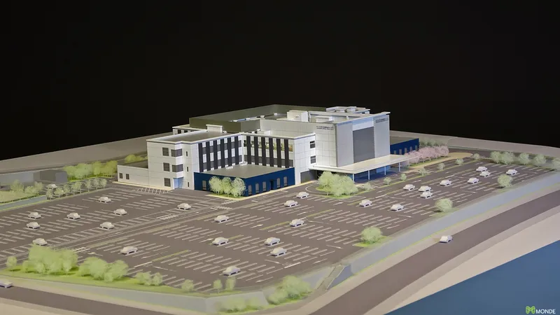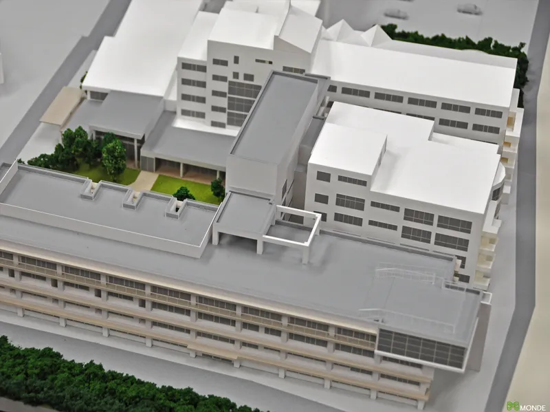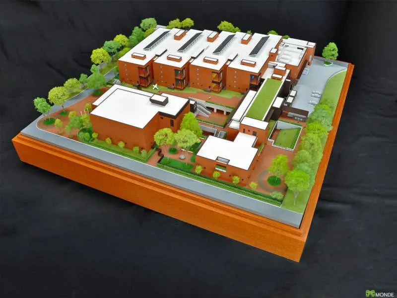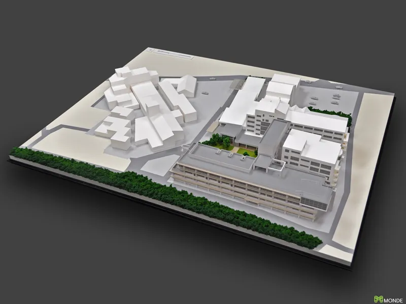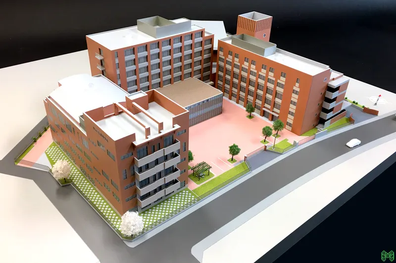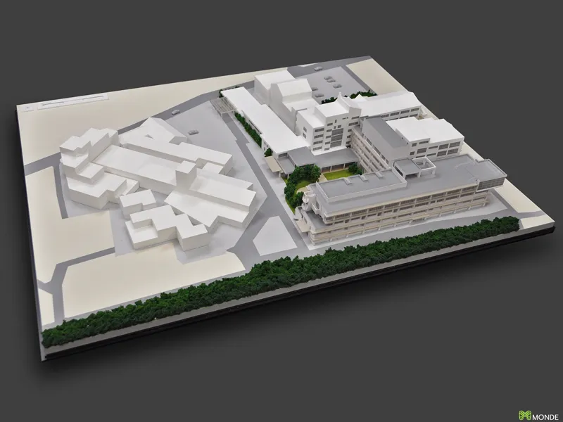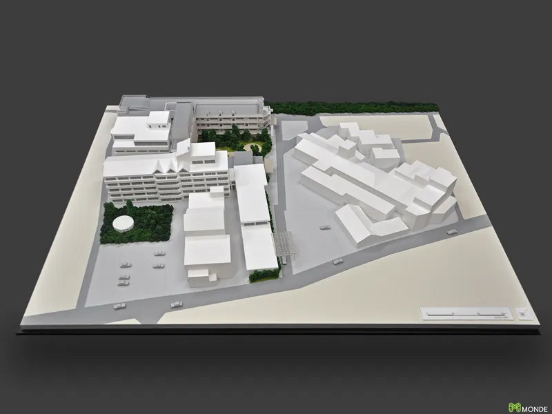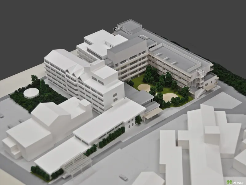 総合病院の建築模型。広大な敷地での配置計画や動線を表現。