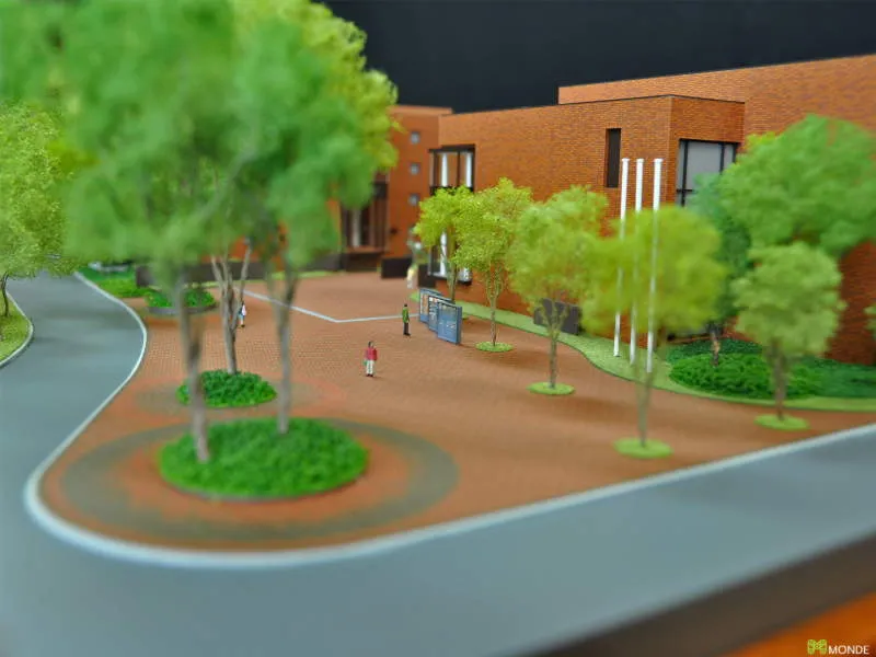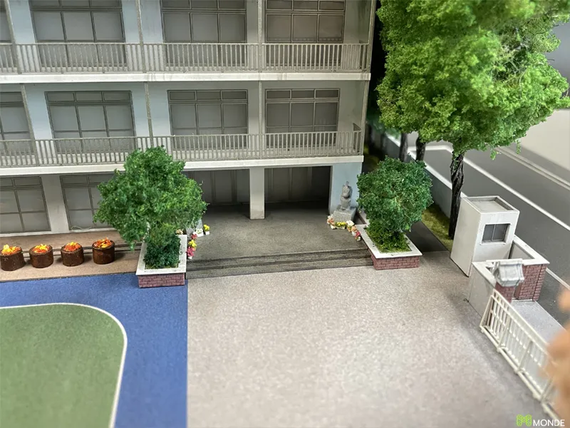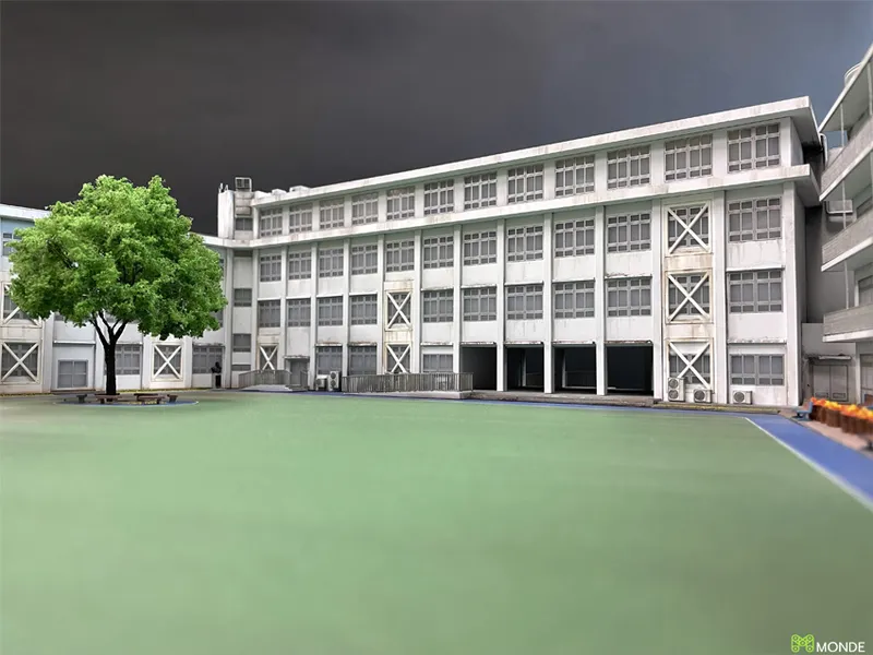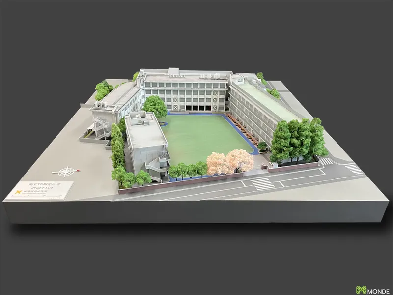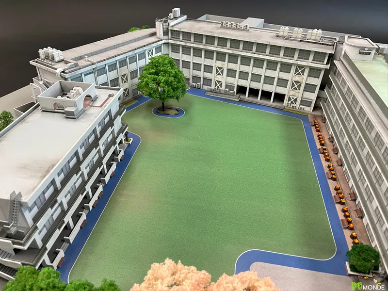 キャンパス全体のジオラマ模型。校舎、グラウンド、植栽を再現。