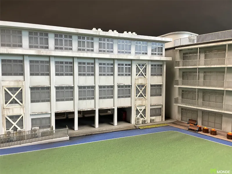 歴史ある校舎の保存用模型。ウェザリング(汚し塗装)で再現。