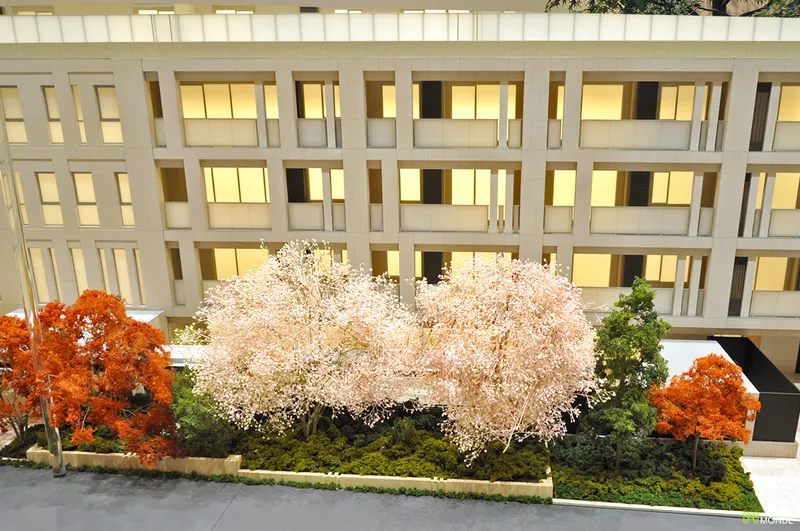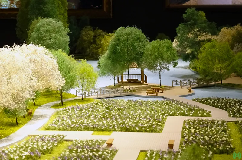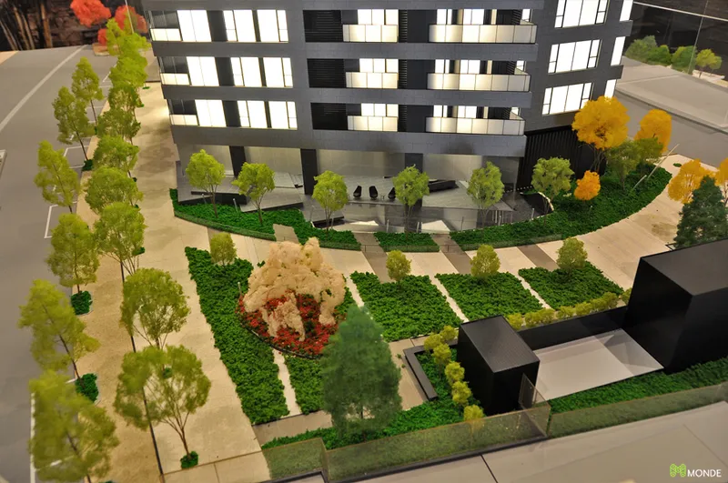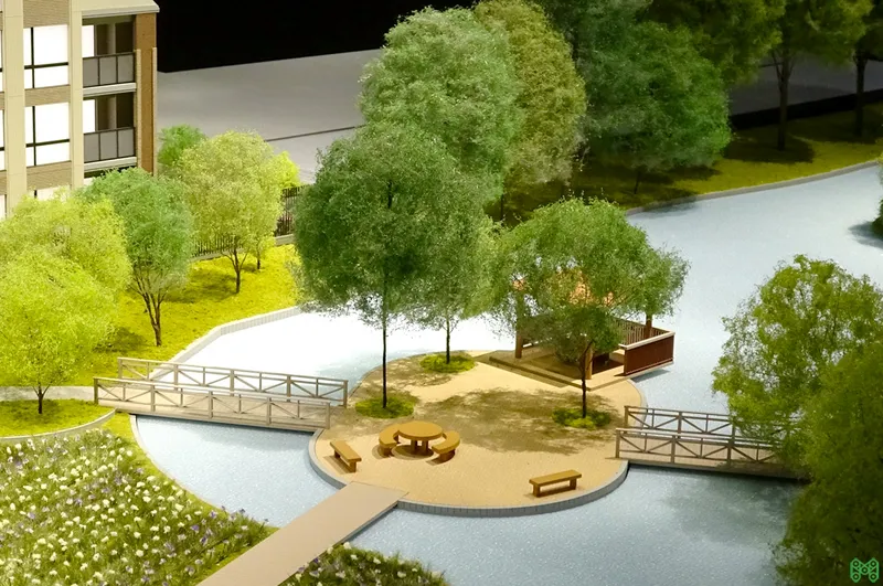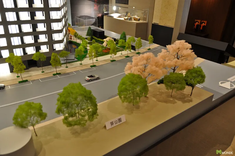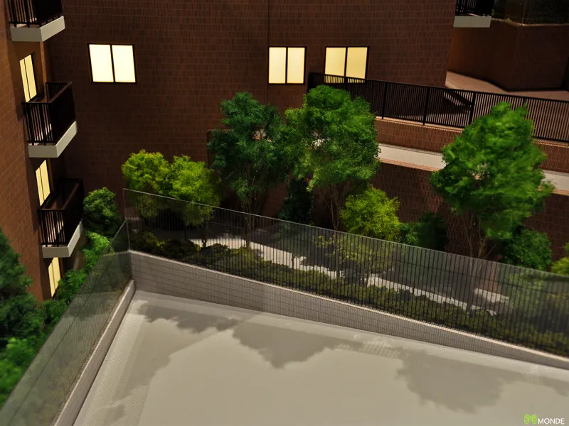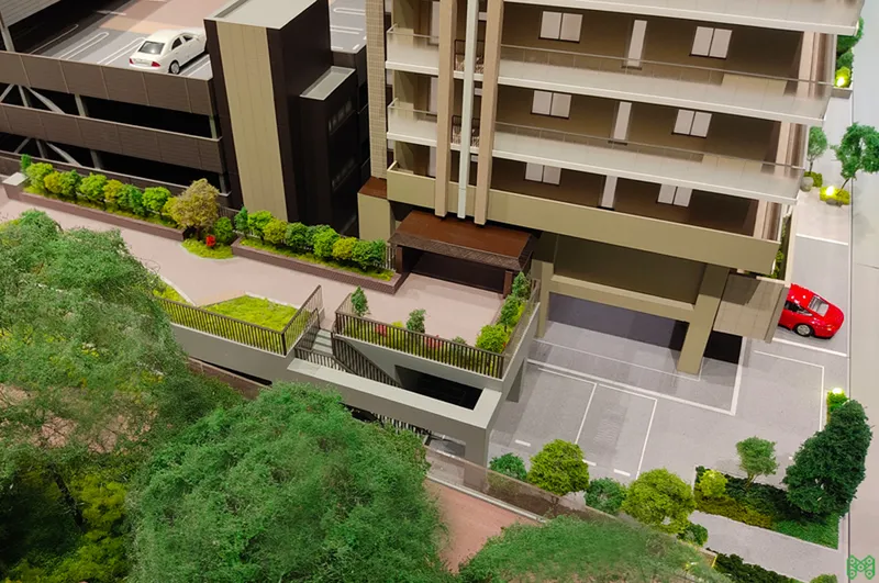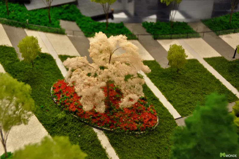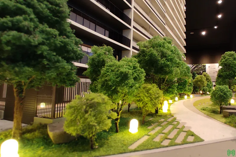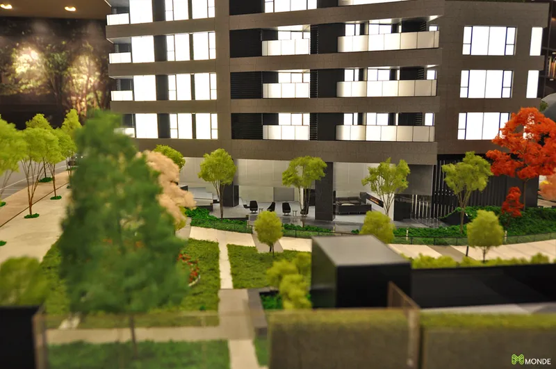中庭や提供公園など、豊かなランドスケープを魅力的に伝える販売用模型。