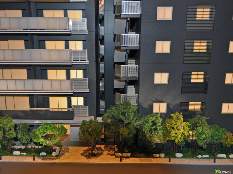 高級レジデンスの重厚感を再現。石貼りのアプローチや照明演出。