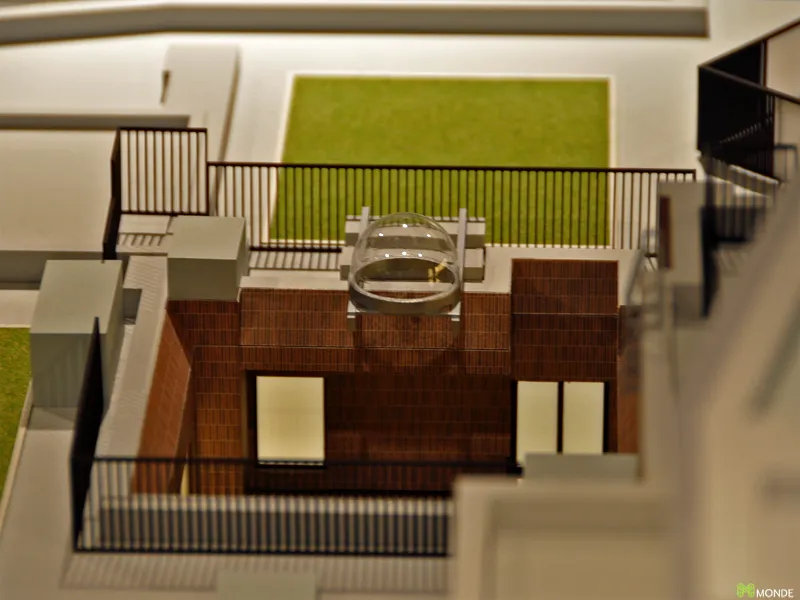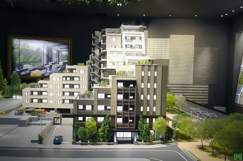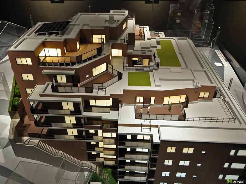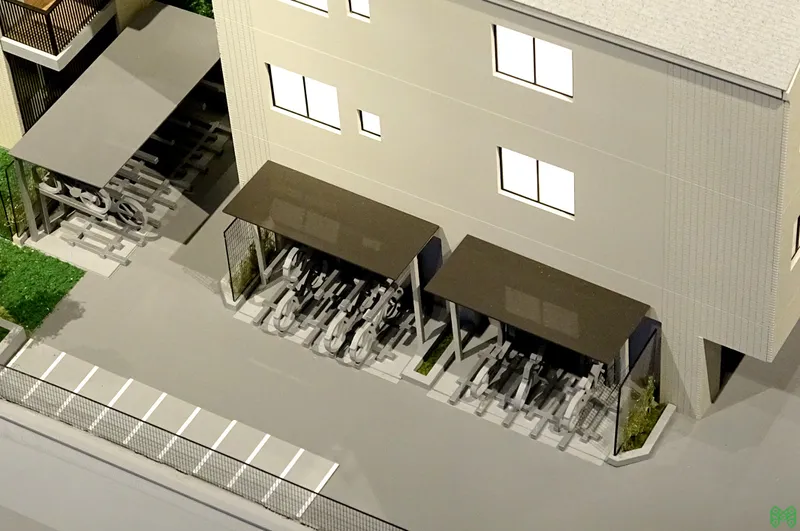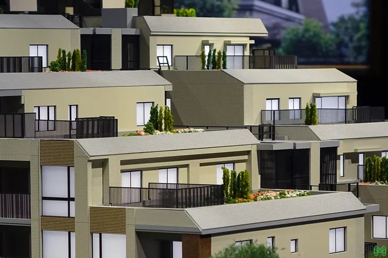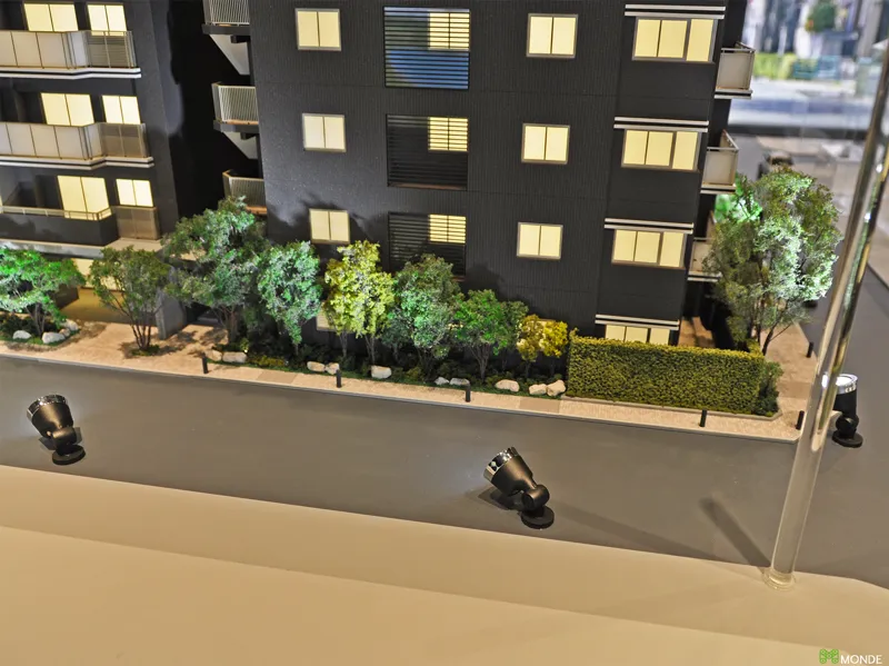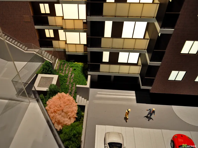 低層レジデンスの緻密な模型。専用庭や共用廊下も作り込み。