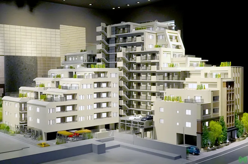 モデルルームや販売センターで来場者の目を引く展示用模型として、また設計段階でのボリューム検討用として、数多くのマンション模型を手掛けております。