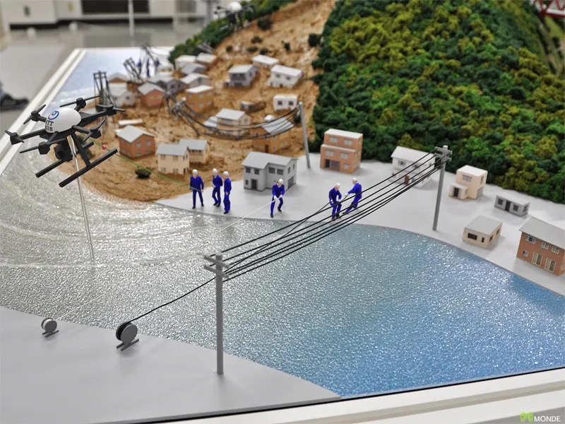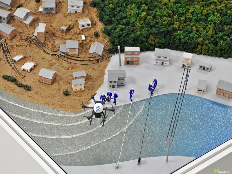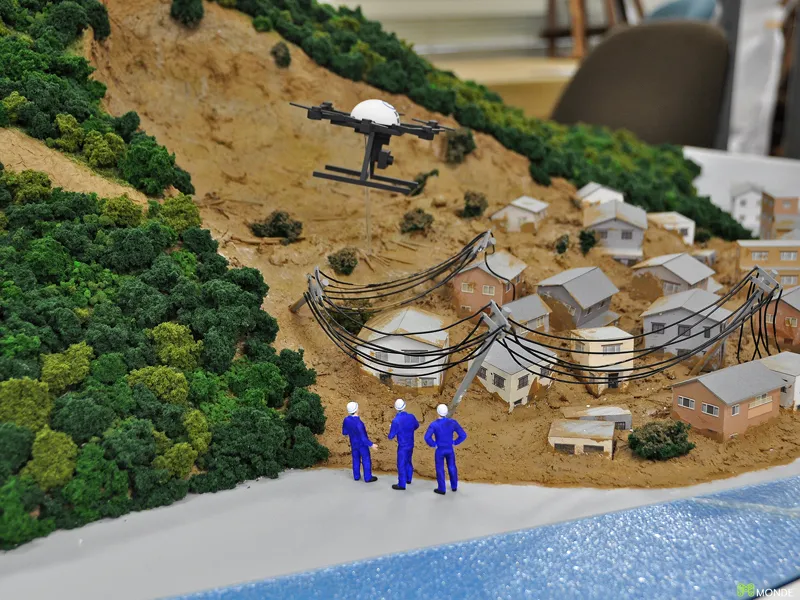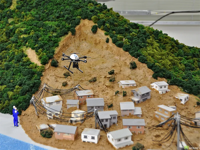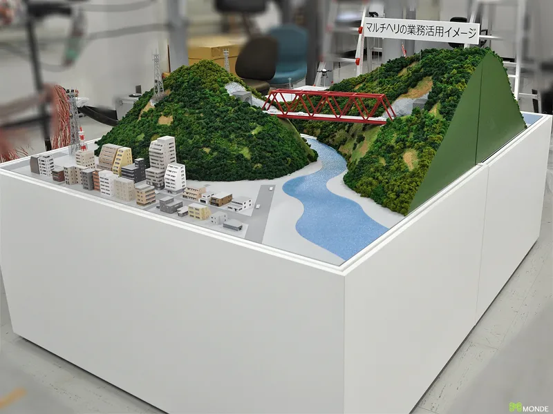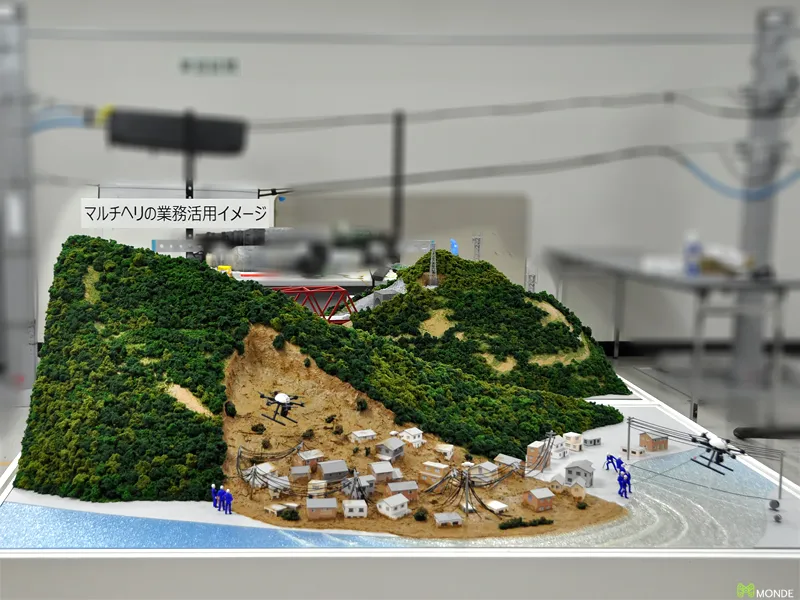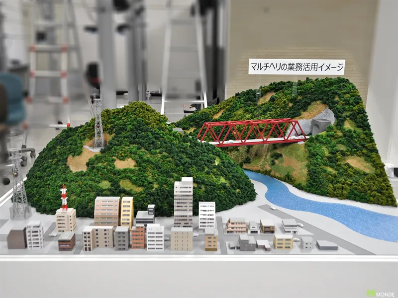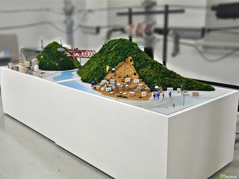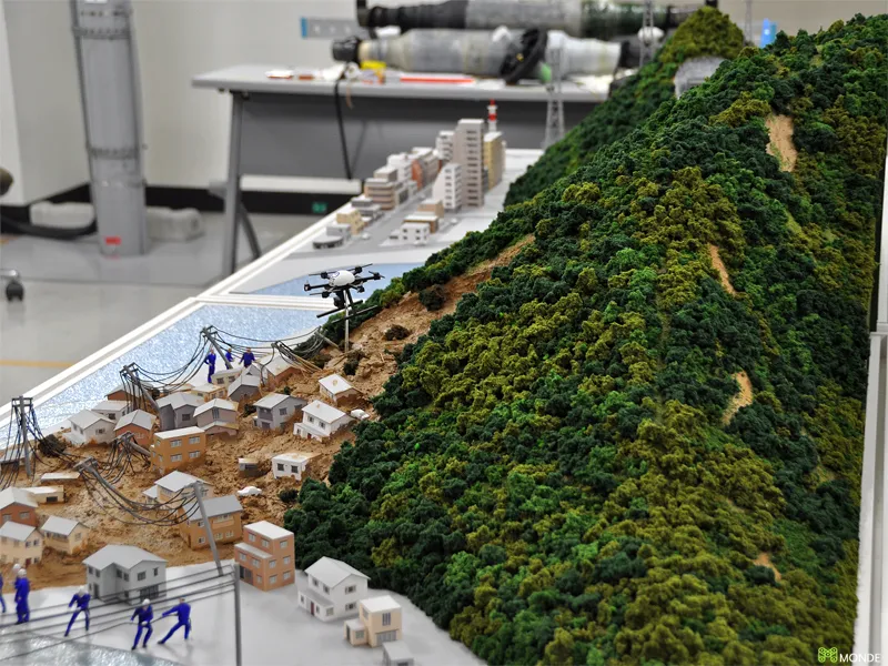 ドローンの業務活用シーンを再現したジオラマ。インフラ点検や災害対策のシミュレーションに。