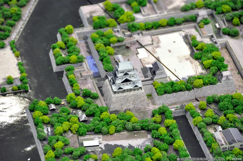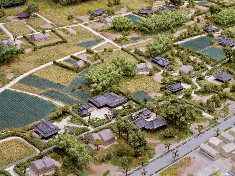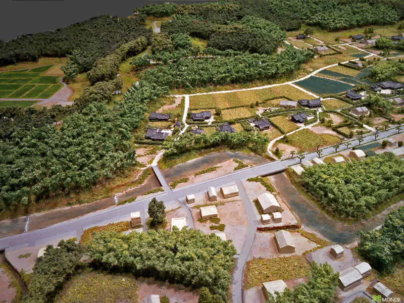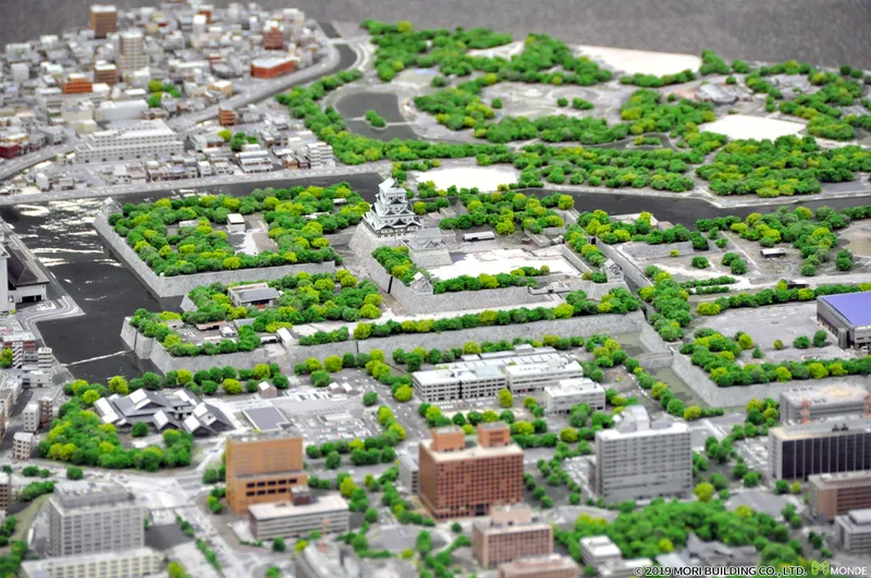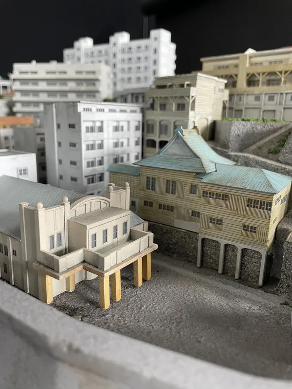 博物館展示用の精密ジオラマ。瓦屋根の家屋や川など周辺環境を忠実に再現。