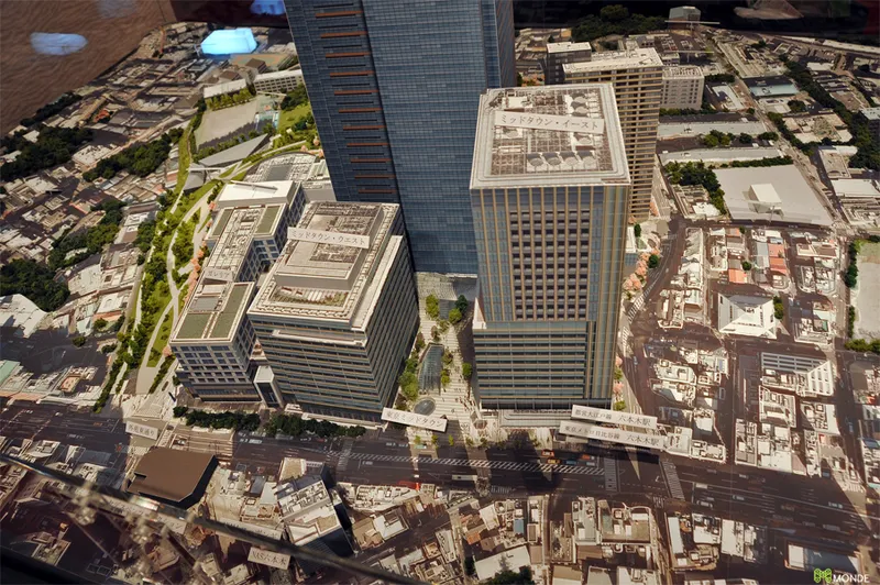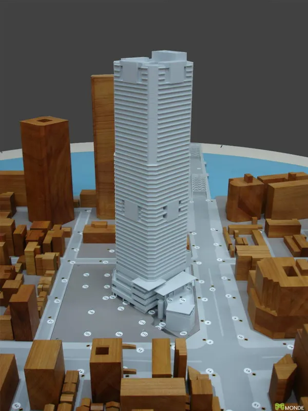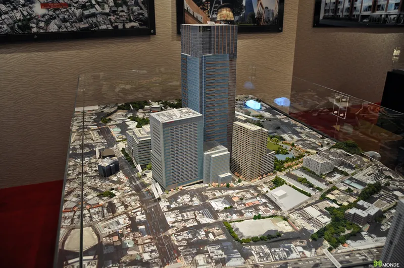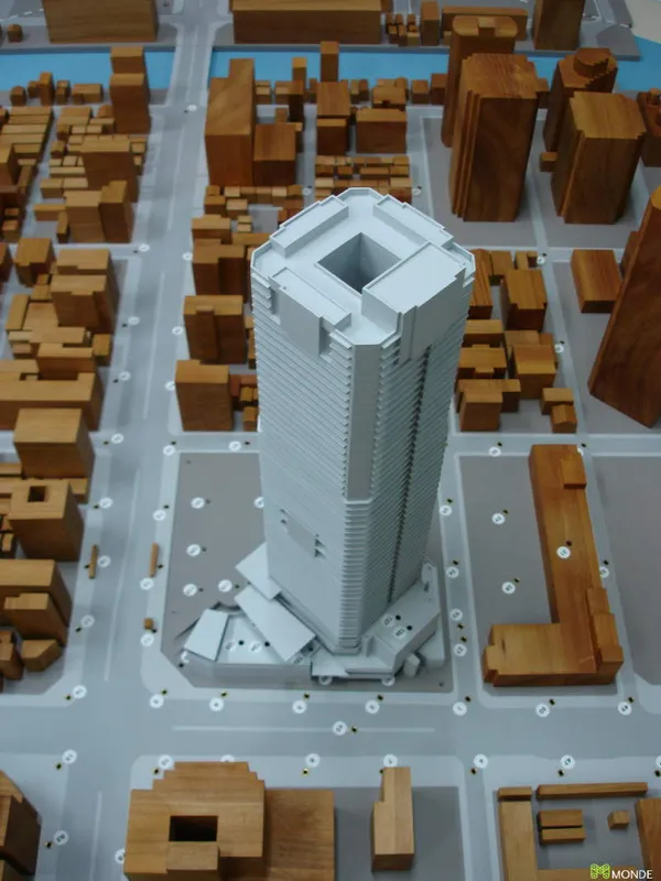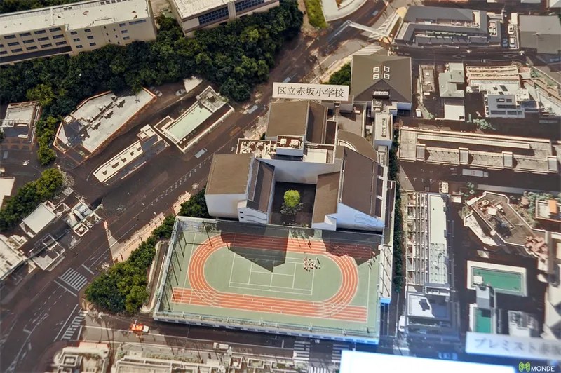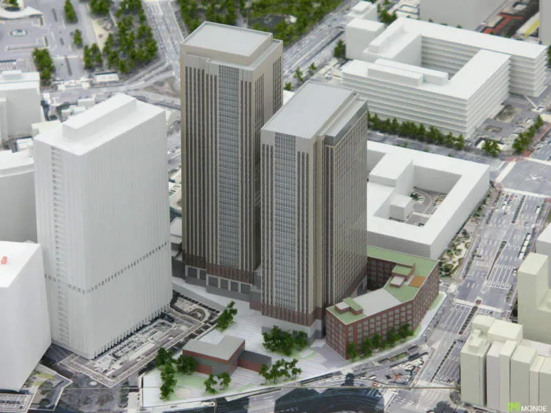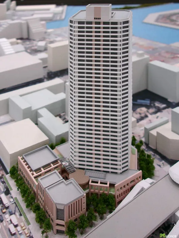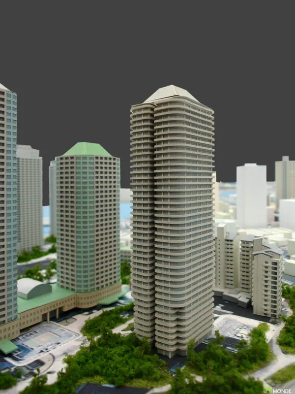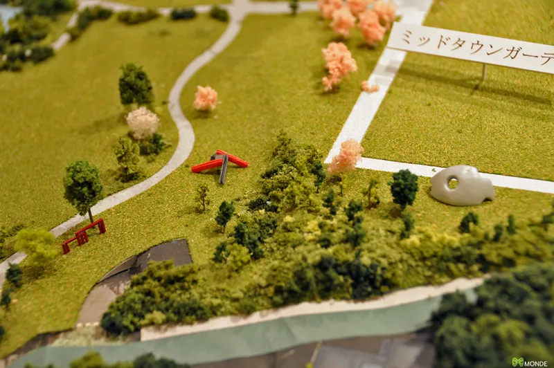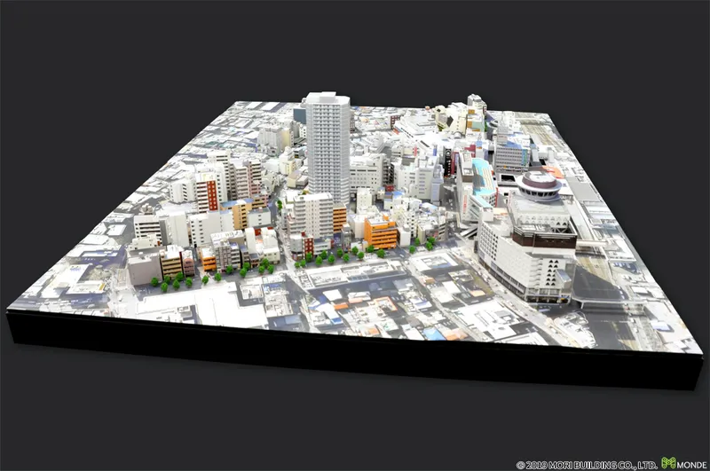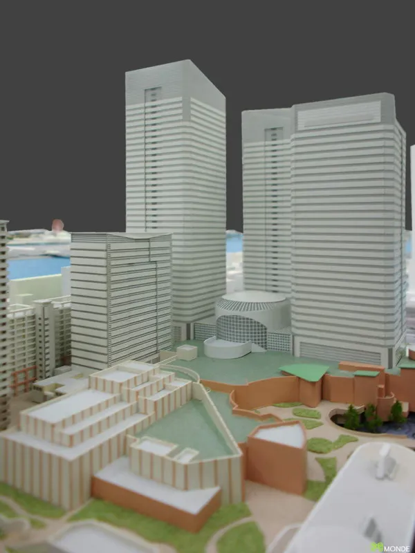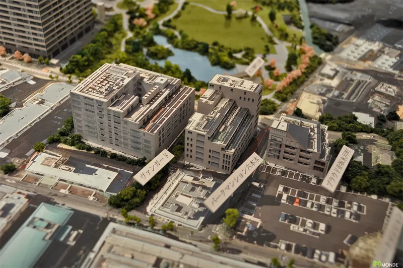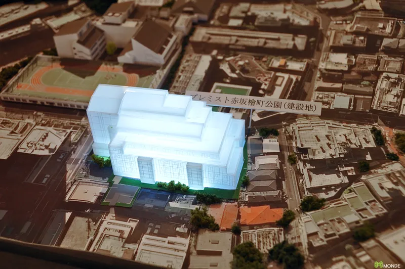 ミッドタウン隣接の立地をアピール。航空写真地盤と詳細な建物表現を融合。マンション販促用模型。