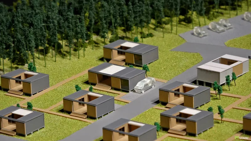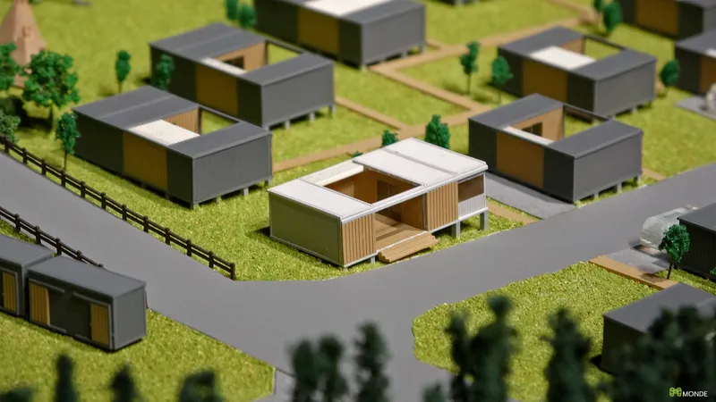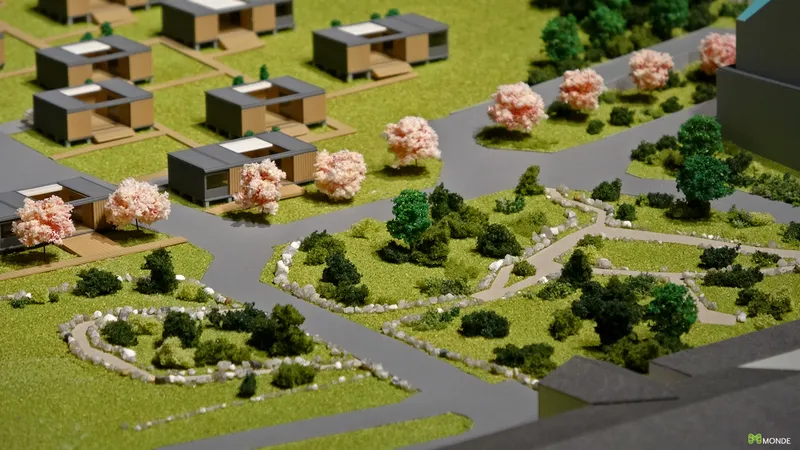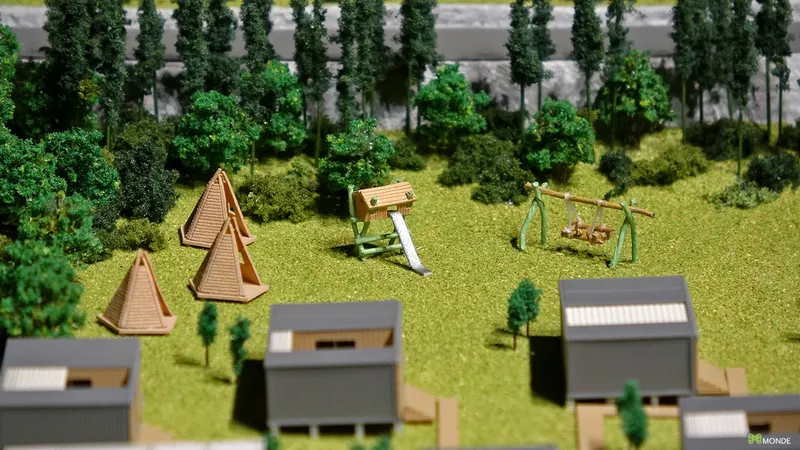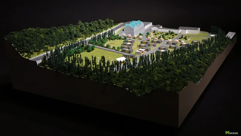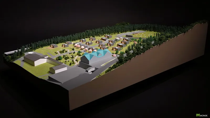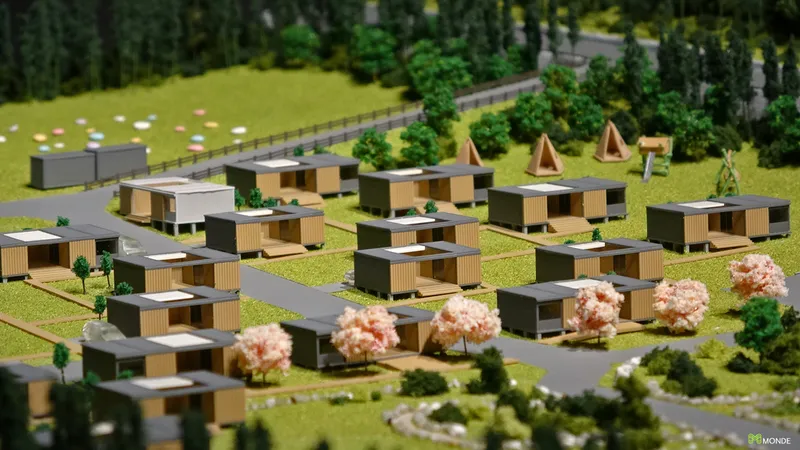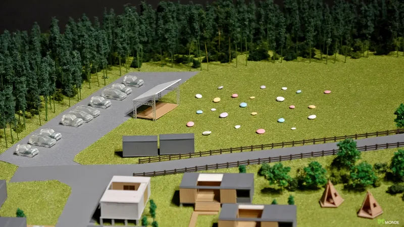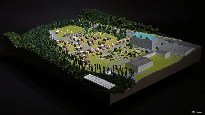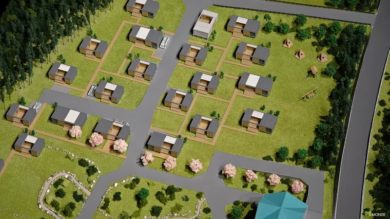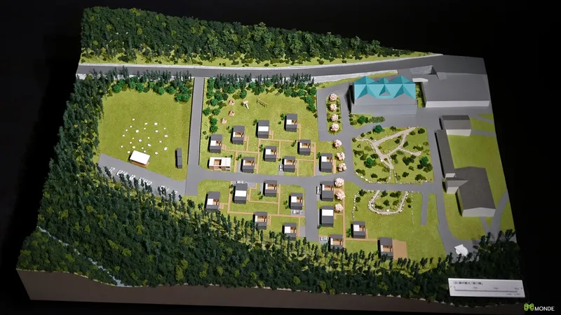 富士山の麓に広がるグランピング施設。キャビンや植栽を詳細に表現しました。