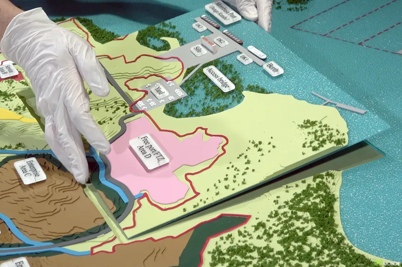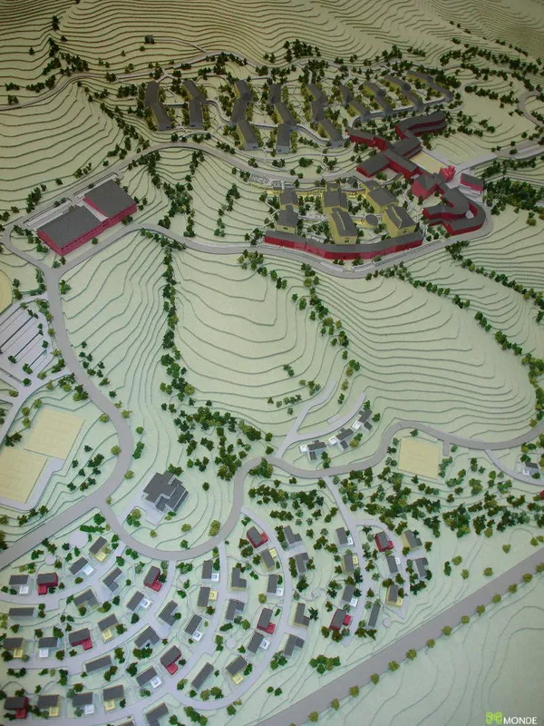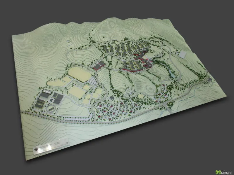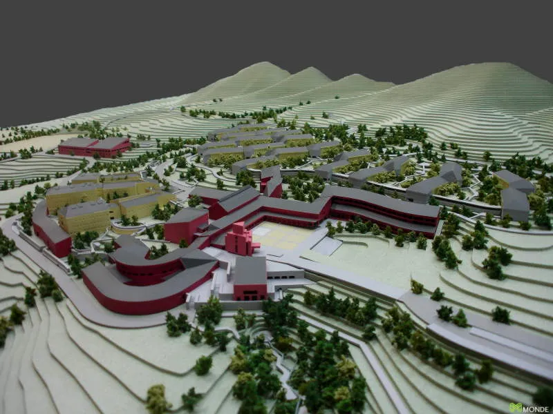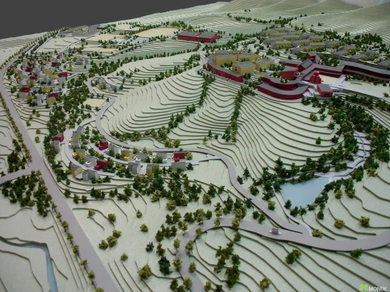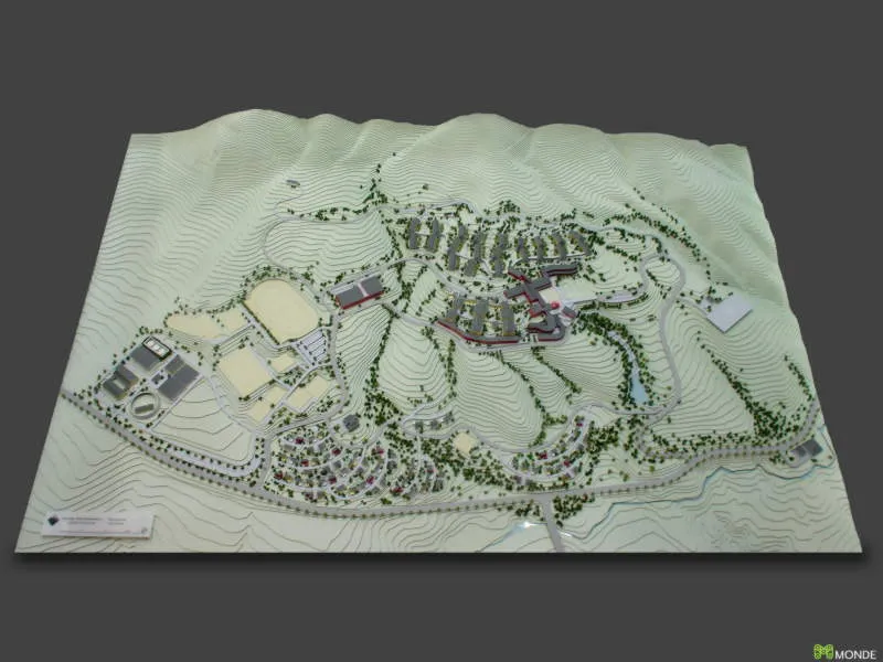 広大な敷地の地形を積層で表現したコンセプト模型。海外輸送にも耐える設計です。