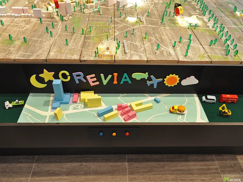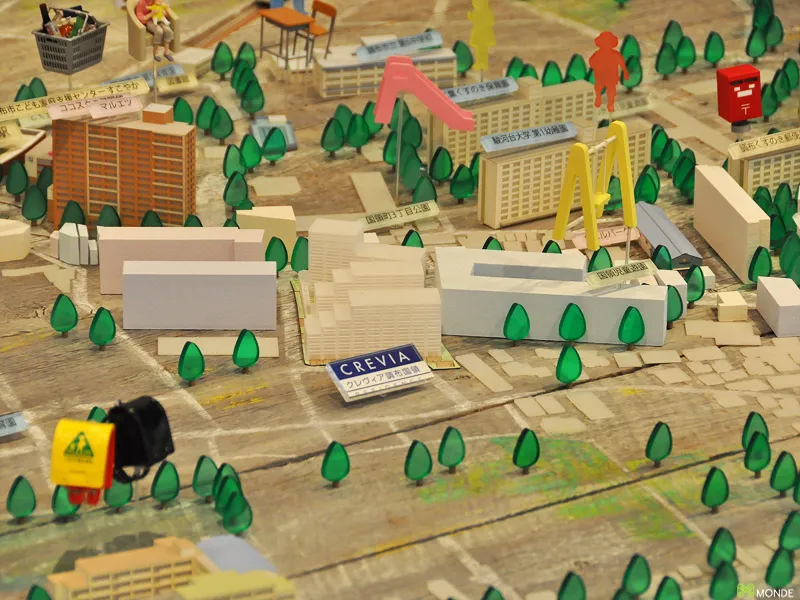 天然木とパステルカラーの温かな模型。子供が遊べる「幼児向け模型」も併設。