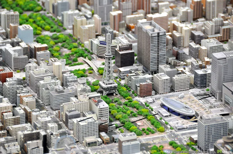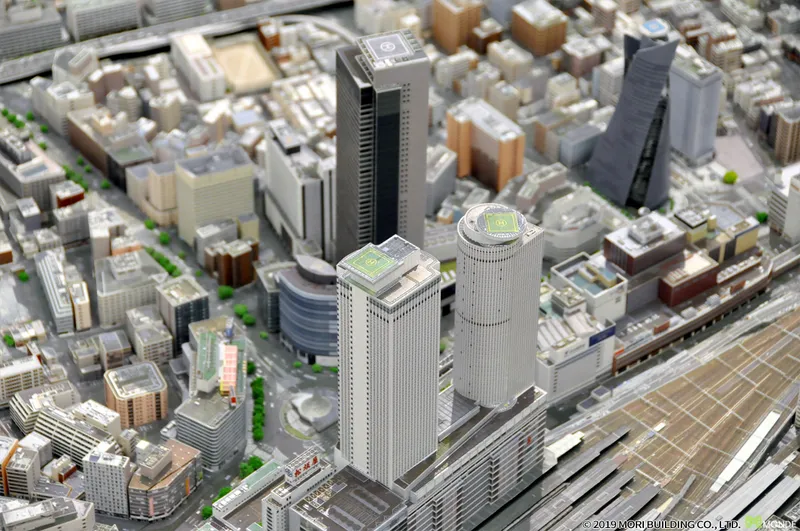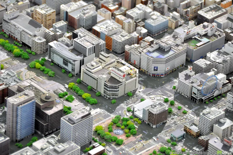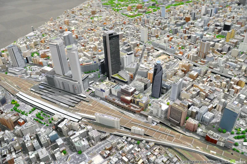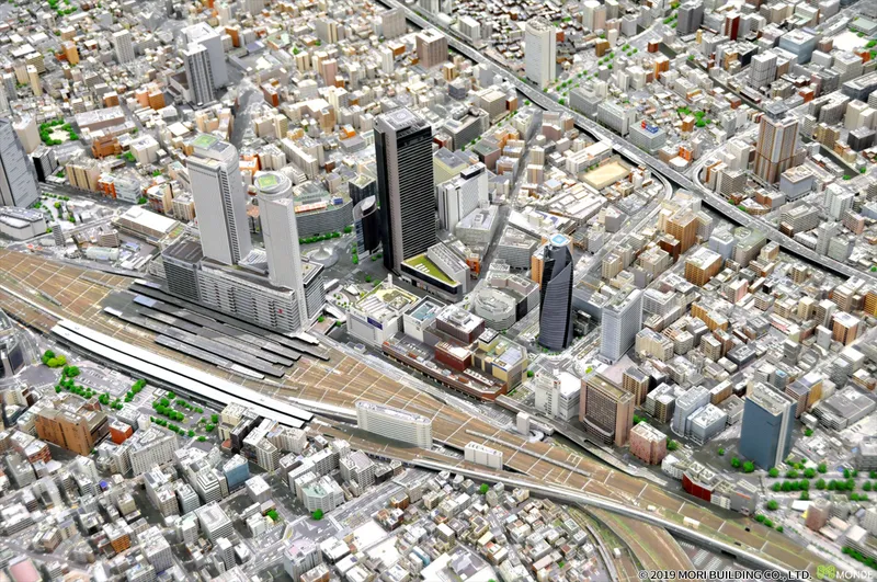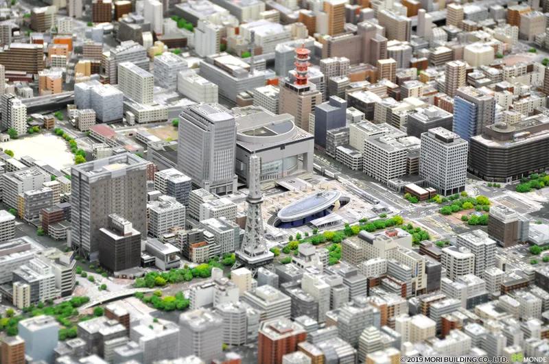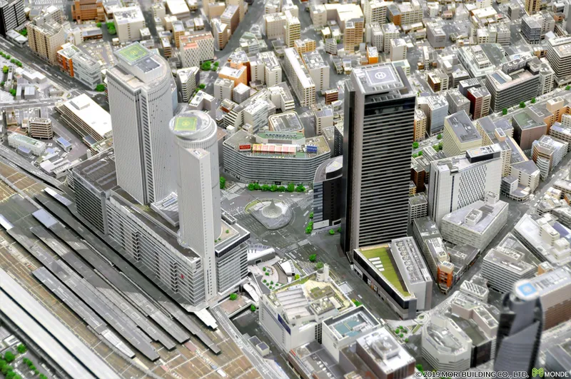 1/1000スケールで再現された名古屋都心部。再開発エリアの検討用模型です。