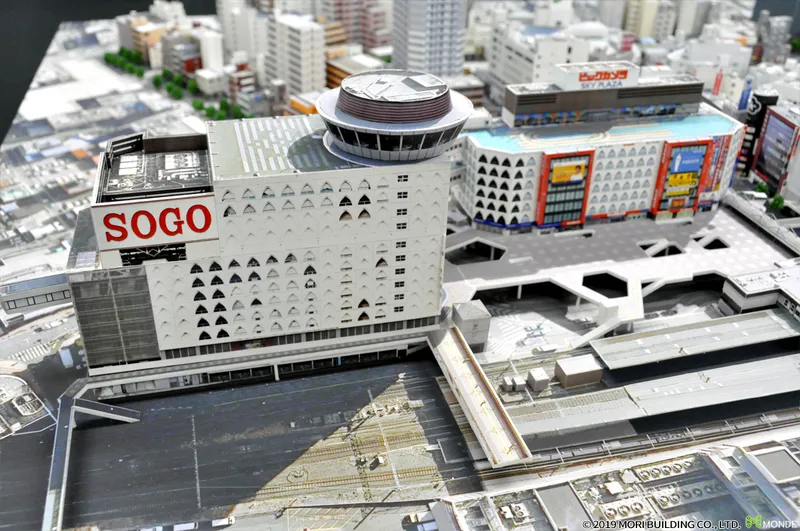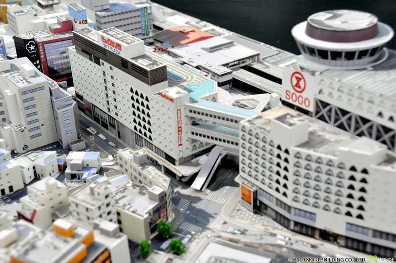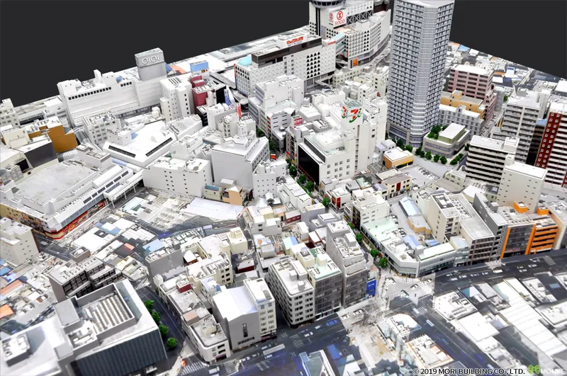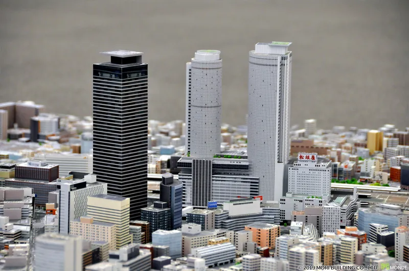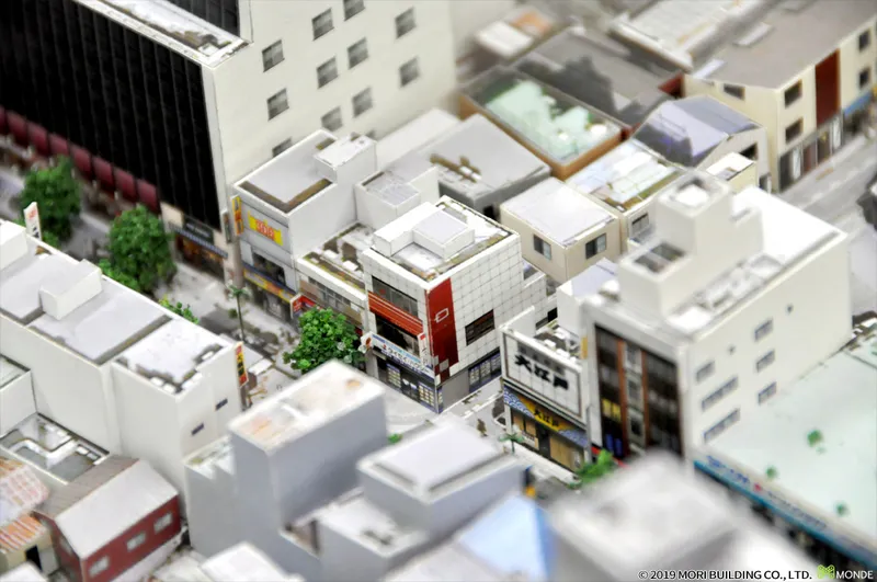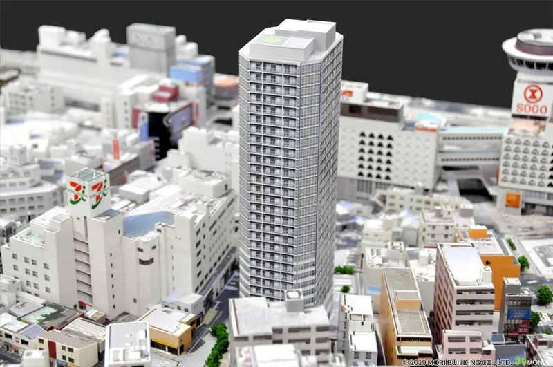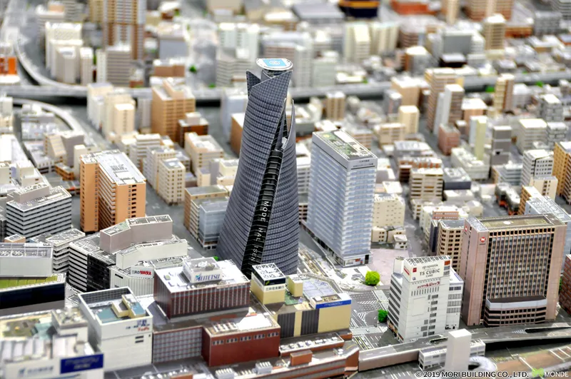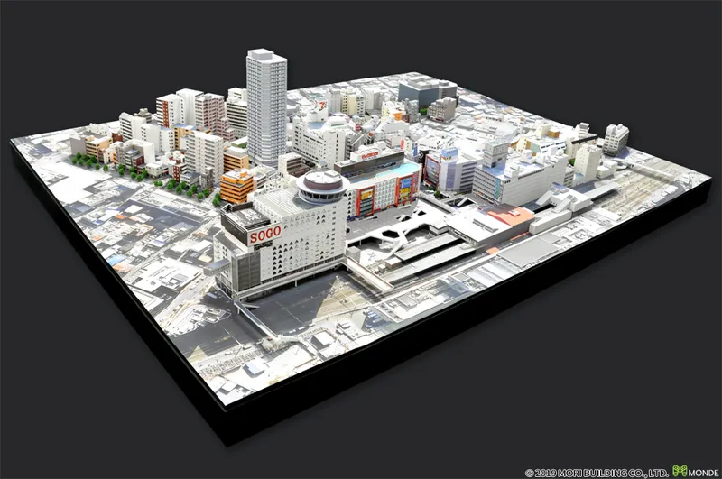 1/1000スケールで再現された名古屋都心部。再開発エリアの検討用模型です。