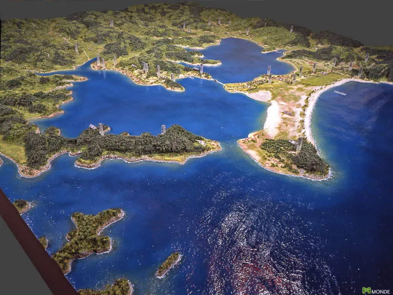 博物館展示用の地形復元ジオラマ。水深による海の色調や波の表現にこだわりました。