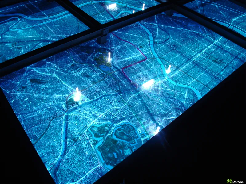 約5m×5mの床面設置型ジオラマ。強化ガラスの上を歩いてアクセス網を体感できます。