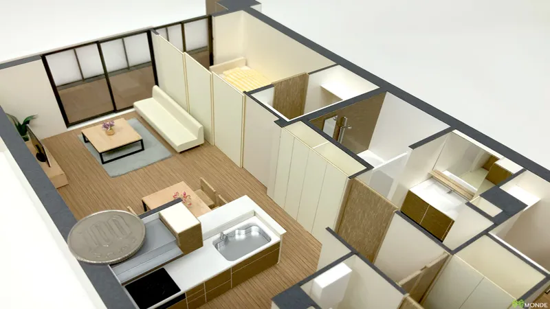 和室や対面キッチンを備えたファミリータイプの室内模型。