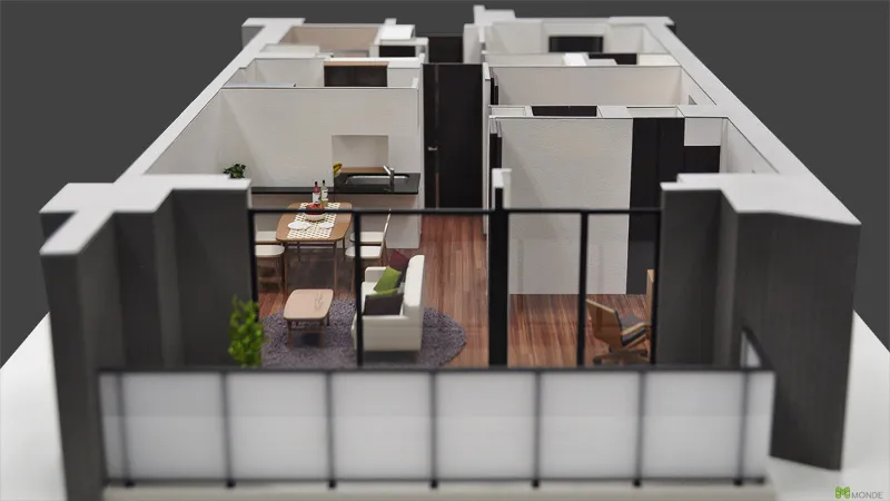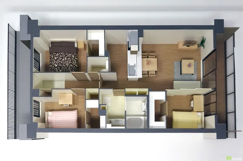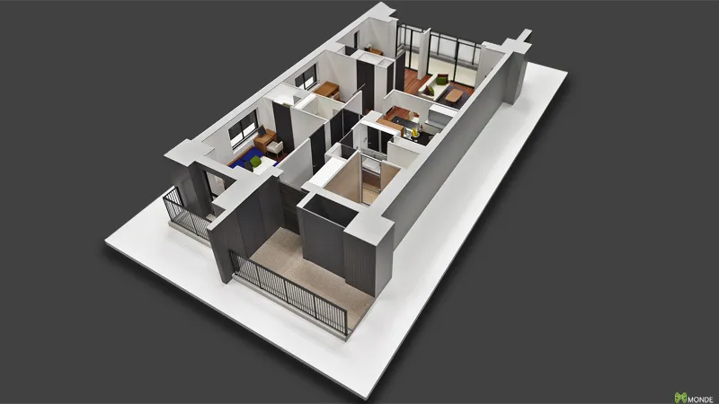 マンションのモデルルーム展示用や、店舗・オフィス・商業施設の内装デザイン検討用として、壁や天井を取り払った状態(または断面)で内部空間を可視化します。