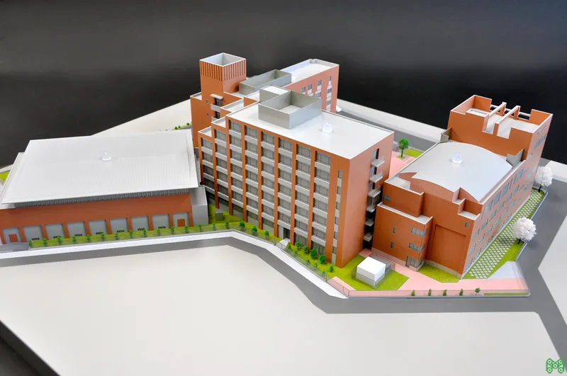 総合病院の建築模型。広大な敷地での配置計画や動線を表現。