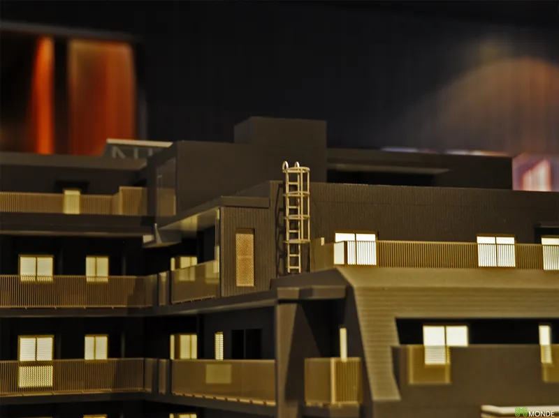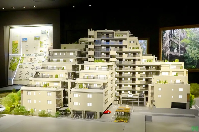 低層レジデンスの緻密な模型。専用庭や共用廊下も作り込み。