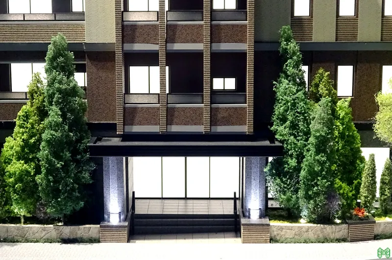 エントランス周りの質感や植栽を詳細に表現し、物件のグレード感を伝えます。
