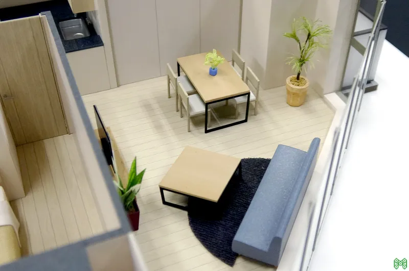 タワーマンションのモデルルーム模型。高級感あるインテリアコーディネート。