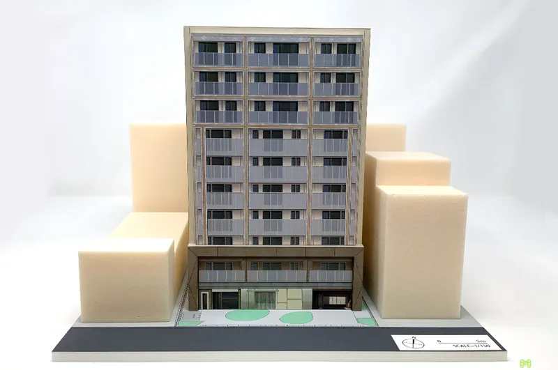 完成模型(プレゼンテーション模型)とは異なり、スチレンボードや木材などを素材のまま使用したシンプルな表現が主流ですが、株式会社モンドでは、設計者の思考プロセスを可視化するため、短納期・低コストでありながらも高い精度の模型を提供しています。周辺環境との関係性確認や、施主様とのイメージ共有ツールとしても最適です。