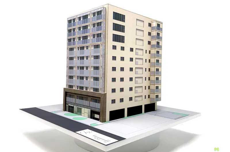 南青山の閑静なエリアに計画された低層マンションのスタディです。外観の特徴となるルーバーのデザインや、居住者の憩いの場となる中庭・アプローチの空間構成を、模型を通して詳細に確認しました。